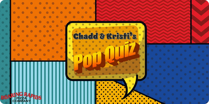 Test your trivia smarts with Chadd & Kristi’s Daily ‘Pop’ Quiz every weekday morning between 7-8am for your chance to win a great prize, including a Roaring Rapids Pizza!